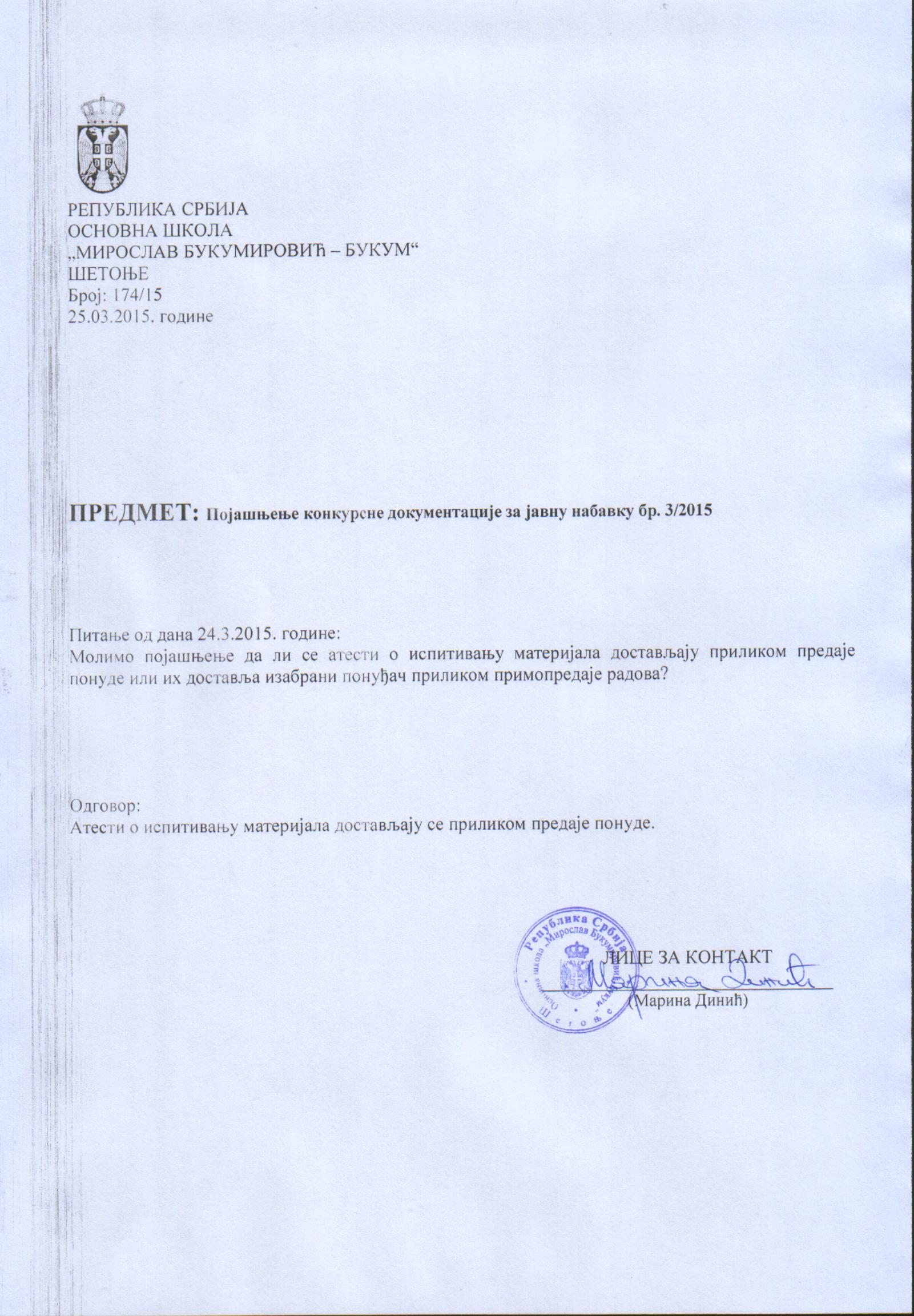 - Позив за подношење понуда у поступку јавне набавке мале вредности за доделу уговора о набавци ДОБАРА- ХРАНА, НАМИРНИЦЕ ЗА ЂАЧКУ КУХИЊУ ЗА ПОТРЕБЕ ОСНОВНЕ ШКОЛЕ „Мирослав Букумировић-Букум“
