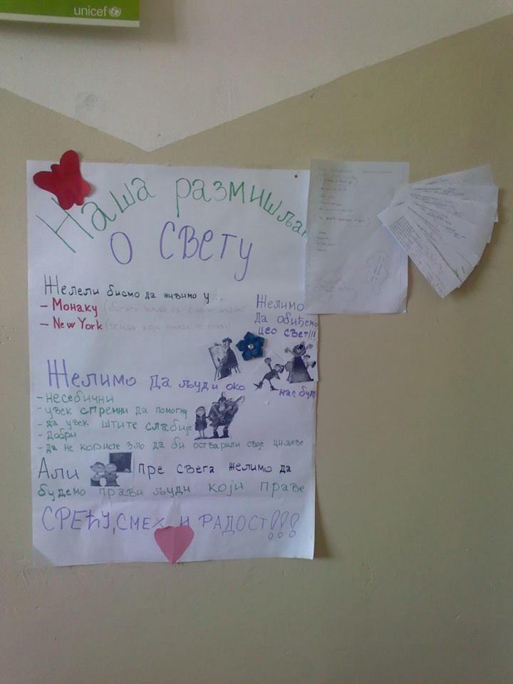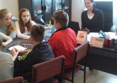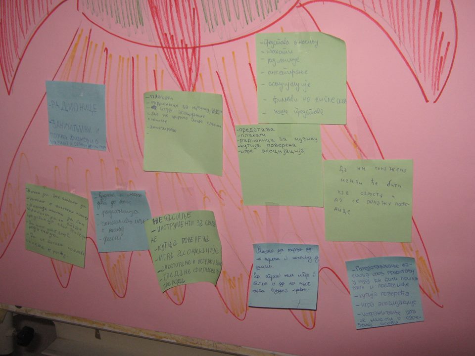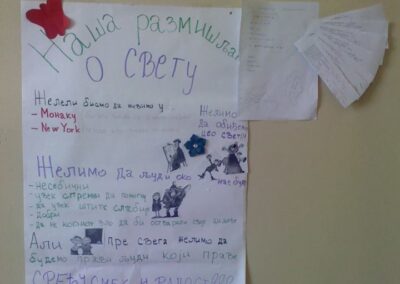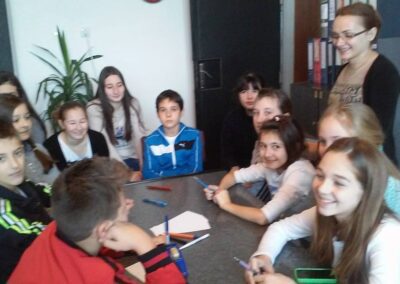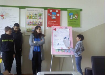 Вршњачки тим пројекта “Школа без насиља” реализује радионице чији су циљеви: подстицање тимског рада, подстицање доживљаја припадности групи, експлорација слике о себи и другима, стицање увида о важности залагања за равноправност, истраживање начина за смањење насиља …
